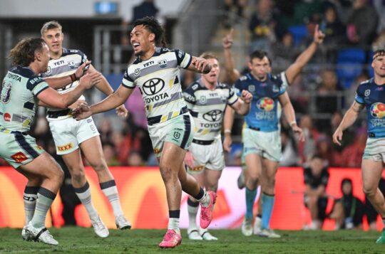 The Cowboys have beaten the Titans 30-24 on a wet afternoon at Cbus Super Stadium on the Gold Coast, turning up the heat on Des Hasler's coaching future.