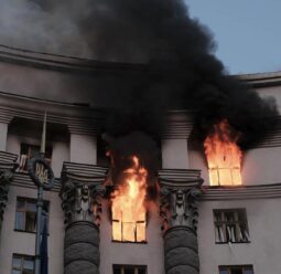 An infant is among the victims of Russia's latest strike on Kyiv, officials say, as Ukraine's main government administrative building is set ablaze.