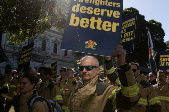 Firies march on Vic parliament as pay dispute deepens