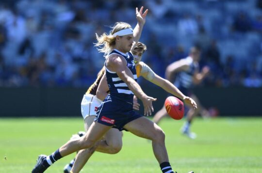 Star Geelong recruit Bailey Smith sat out their pre-season loss to Essendon with a knee injury, but he is rated a certain starter next week against Brisbane.
