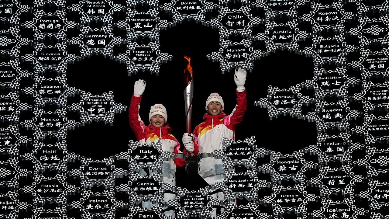 Two young Chinese athletes, cross-country skier Dinigeer Yilamujiang and Nordic combined skier Zhao Jiawen, were given the honour of lighting the snow-flaked formed Olympic cauldron at National Stadium.