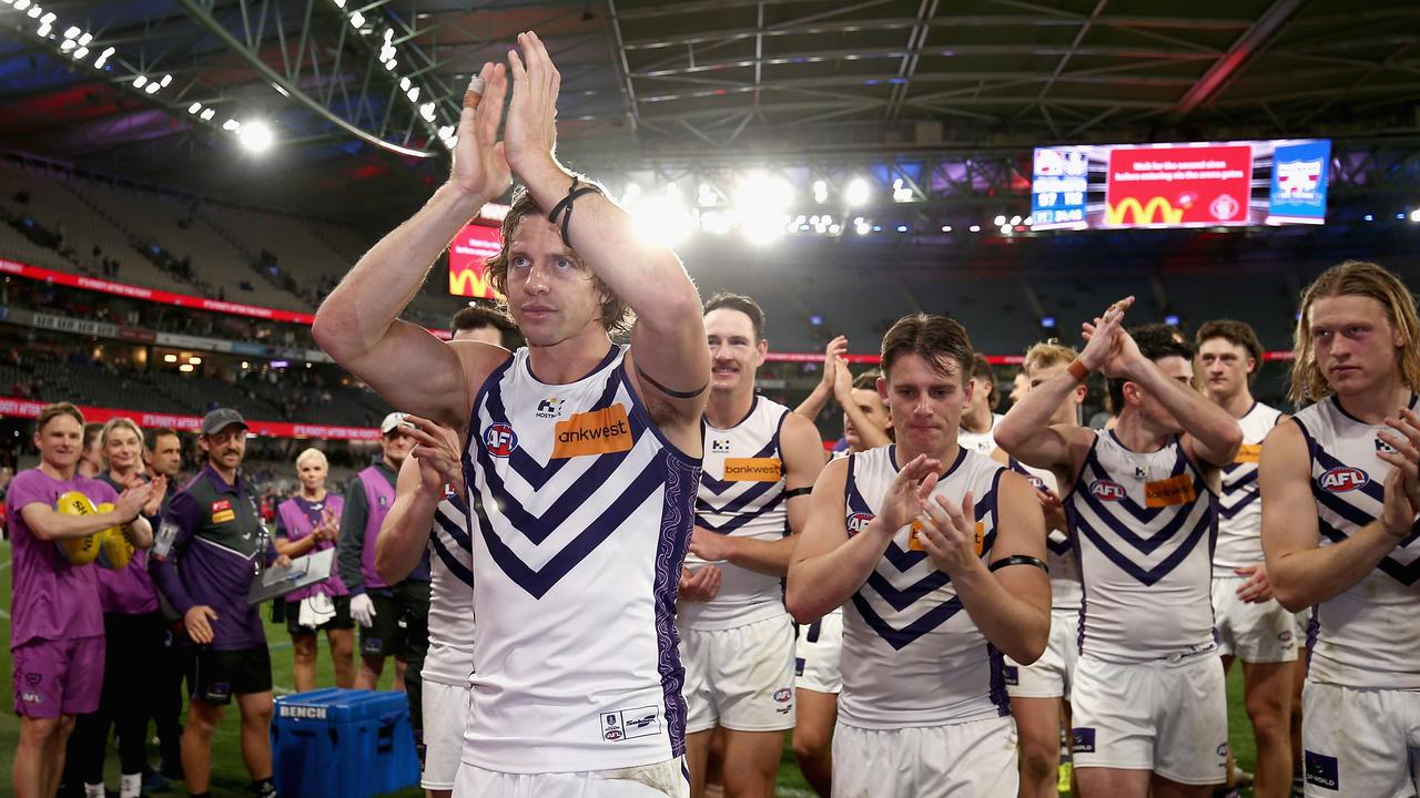 Fyfe’s last hope of a flag looked shot when he injured his calf while doing a halftime warm-up as the sub in the round-16 win over St Kilda.