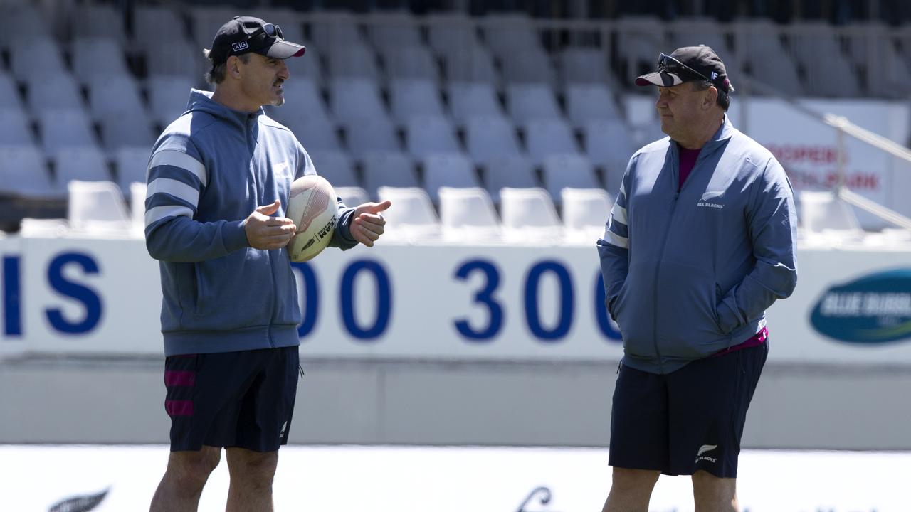 New Wallabies defence coach Scott McLeod (L) while working with the All Blacks under Ian Foster (R).