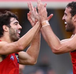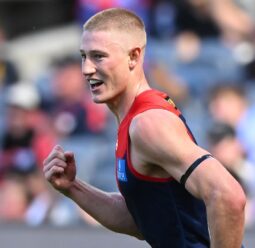 Melbourne have upset St Kilda by 13 points, with Jacob van Rooyen kicking six goals to start the Steven King era with a win.
