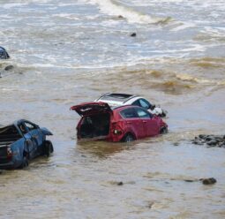 A river has dramatically burst its banks, sweeping cars out to sea and trapping holidaygoers in caravans after "off-the-charts" rainfall caused major flooding.