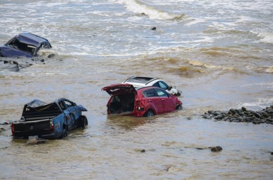 Wrecked cars choppered out of surf as fire threat grows