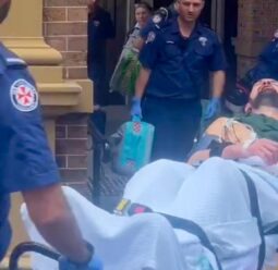 After being found guilty of murder, a bloodied and groaning man has left court on a stretcher with a self-inflicted wound.