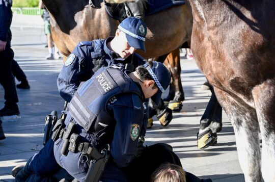 Hundreds of protesters have clashed with police outside a defence forum leading to arrests and injuries, with the group's leader crashing a press conference.