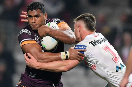 Brisbane are on top of the NRL ladder after a thrilling 29-18 win against Canberra, with winger Selwyn Cobbo grabbing a hat-trick of tries.