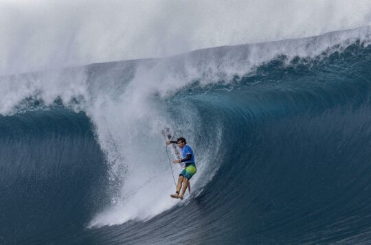 Australian two male surfing hopes are through to the last eight in Tahiti with Jack Robinson and Ethan Ewing triumphing in scary surf.