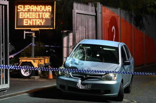 A pedestrian is dead and another is clinging to life after the pair were struck by a car outside a busy comic convention.